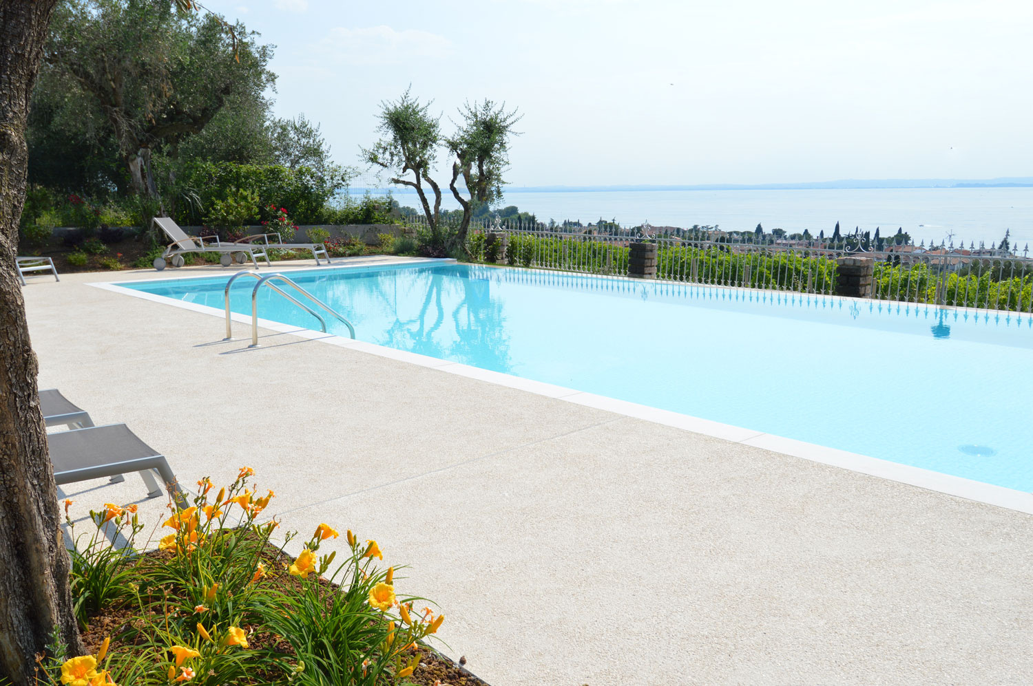 Construction: flooring of the swimming pool edge, solarium and walkways in ItalianTerrazzo® exposed aggregate paving for a private residence overlooking Lake Garda